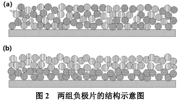 为了能够得到兼顾高体积能量密度和快充的负极片,本文将两组石墨复合使用。图2是本文所设计的两组负极片的结构示意图,图中圆球代表石墨颗粒,石墨颗粒组成了负极涂层,涂层下边是铜箔,涂层中的分散剂、粘接剂和导电剂等未画出。
