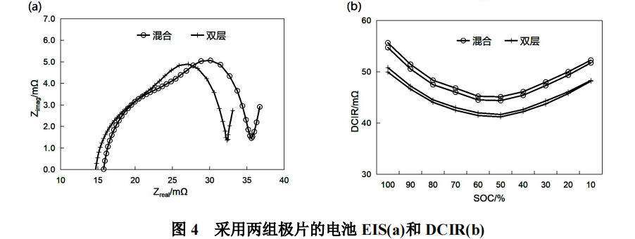 在进行充电或放电时,电解液中的锂离子分布开始存在差异,靠近隔膜的电极表层优先发生嵌锂或脱锂反应,增加此区域石墨的反应动力学可以降低极片的极化和电池阻抗。相比混合极片,双层极片的表层石墨全部是有包覆无定形碳,具备较高的反应动力学,因此可以明显降低电池EIS阻抗和直流内阻。
