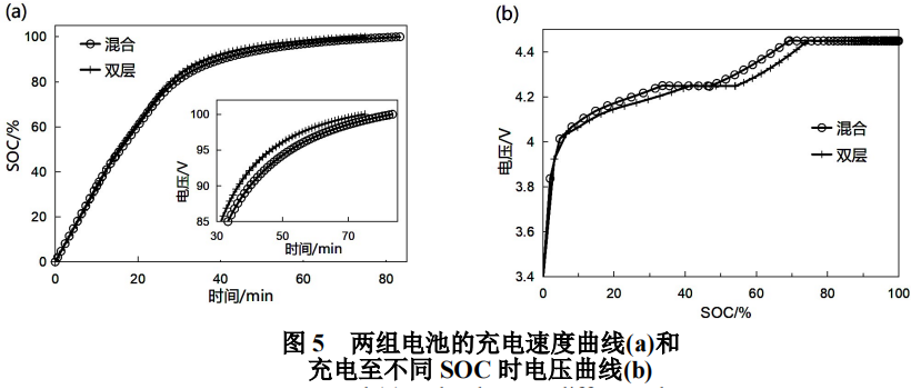 图5是25℃下两组新鲜电池的充电速度曲线和充电电压曲线。如图5a所示,以2C阶梯充电,采用混合极片和双层极片的电池充满电的时间分别是83.4min和74.9min,相差8.5min。采用双层极片可以将充电速度提高10%。如图5b所示,以2C阶梯充电,采用双层极片电池的电压曲线较低,说明充电时电池过电位较小,极化较低。过电位低有利于提高恒流充电时间,提高充电速度,缩短充电时间。由图4可知采用双层极片电池具备较低阻抗,所以其充电时过电位低,充电速度更快。