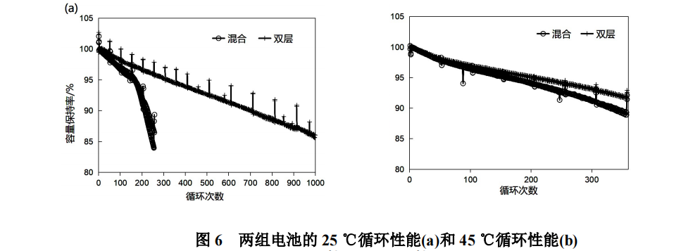两组电池在25℃下的2C 阶梯充电循环曲线如图6a所示。采用混合极片的电池循环很快失效,循环150次之后容量保持率快速下降。这是因为混合极片充电动力学不足,2C阶梯充电时负极片表面容易发生析锂,破坏负极片与隔膜的界面接触,导致产生容量不可逆损失。这是快充型锂离子电池的典型循环失效模式。采用双层极片的电池循环性能很好,1000次之后两只电池的容量保持率分别是85.6%和86.0%。本实验通过调整负极片的设计大幅度提高了快充电池的循环寿命,解决了快充时负极片表面的析锂问题。