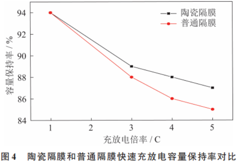由图4可知,在数值方面,陶瓷隔膜在不同倍率充放电的容量保持率均比普通隔膜高,同时,对比充放电倍率提升后容量下降的趋势来看,普通隔膜的下降趋势要比陶瓷隔膜大。两者均说明了陶瓷隔膜的倍率性能要比普通隔膜好。