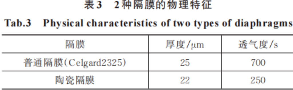 对使用的隔膜厚度、透气度等方面进行分析,陶瓷隔膜和普通隔膜物理特性的对比,见表3。由表3可知,陶瓷隔膜的厚度和透气度均比普通隔膜小。通过对锂离子电池的充放电机理分析可知,影响电池倍率的主要因素为Li+迁移路径和迁移速率,迁移路径越短,迁移速率越快,则电池的倍率充放电性能越优越。