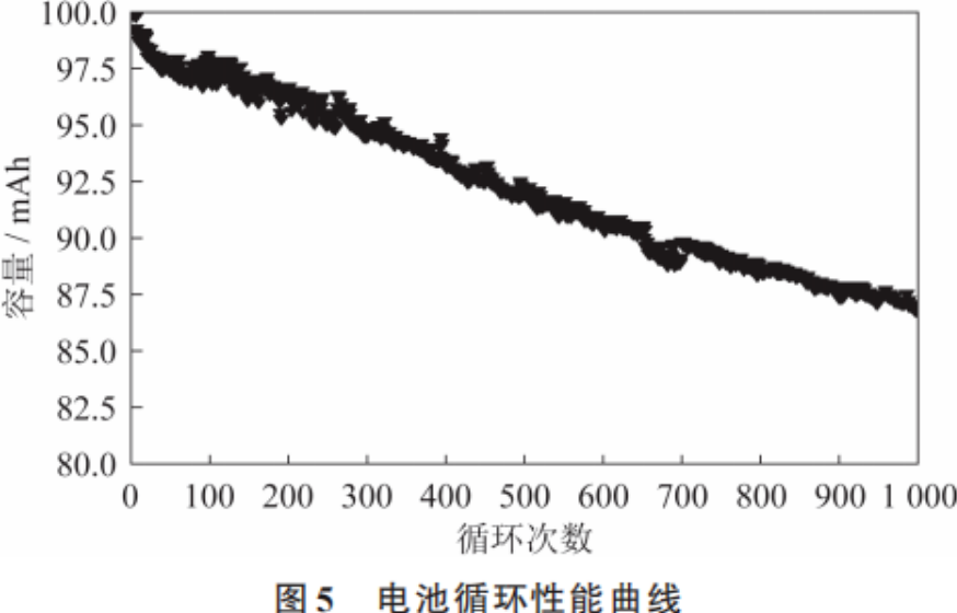 循环结果放电容量曲线如图5所示,电池充放电循环1000次后,容量保持率为86%左右,表明该快充电池具有较好的循环稳定性,同时在快充条件下,整个电池体系具有较高的稳定性。