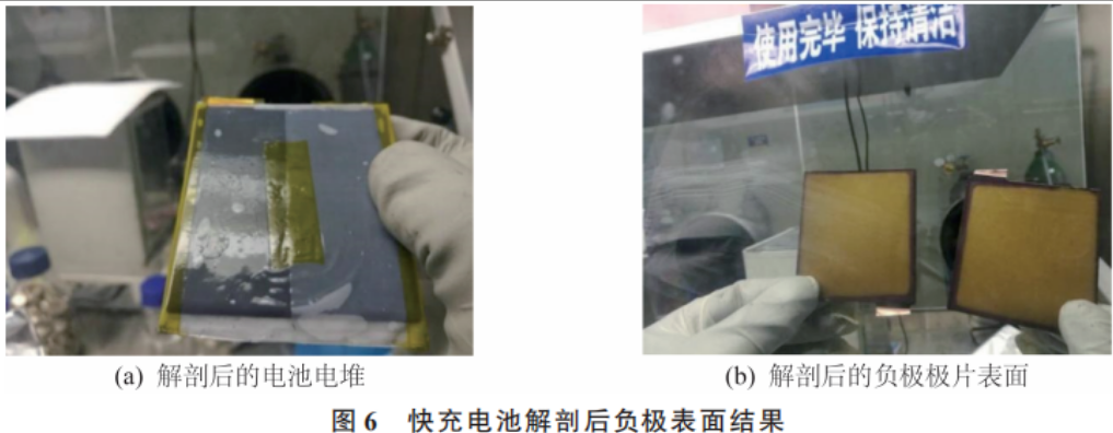 为了考察电极在快速充放电后的极片表面变化,在具有氩气保护的手头套箱中将不同倍率充满电的电池进行解剖,电池5C充满电后解剖结果,如图6所示。