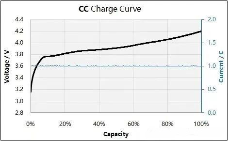 恒流充电过程中,随着时间的持续(SOC的增高),电压逐渐从3.0V升高至4.2V,电流整个过程保持不变。(如下图所示)