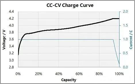 由一块NCM电芯容量为5Ah,用5A的恒定电流对其充电,电压持续上升至设定的4.2 V后停止恒流充电。之后电池电压保持在4.2 V继续充电,此时电流持续降低,一般设置为0.05C,即0.25A。