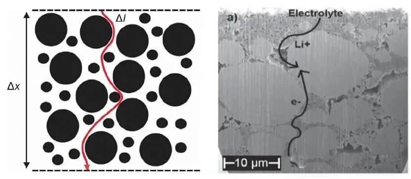 如果把锂离子比作“通勤车辆”,极片的结构就是它们必须穿越的城市路网。迂曲度(Tortuosity)这个物理参数,精准刻画了锂离子迁移路径的”拥堵指数”。如下图所示[1,2],如果极片迂曲度较大,锂离子这辆车就像在九曲十八弯的胡同里面“龟速“挪动,寻找合适的位点与电子相结合,速度自然会慢很多,即无法实现电池的快充。但是,如果极片的迂曲度较小,锂离子这辆车就会像在双向八车道的高速路上疾速奔跑一样,快速到达目标位点与电子结合,此时电池的充放电速度自然就会快很多。传统石墨极片的迂曲度大致在3~7范围内,而新型快充极片的迂曲度则可以降至1.5以下。
