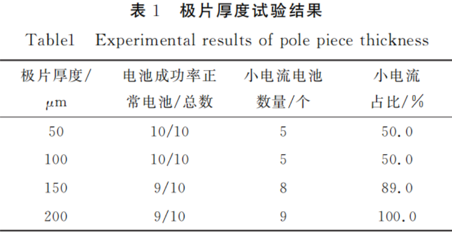 上述试验数据揭示了极片厚度对电池小电流放电现象的影响。具体来说,当极片厚度为50μm和100μm时,电池小电流放电的比例相对较低,大约为50%。这一现象归因于较薄的极片中活性物质与集流体之间更为紧密的接触,从而使得电池的内阻降低。然而,随着极片厚度的增加,尤其是在200μm厚度的极片中,小电流放电的比例显著上升至100%。这种趋势表明,极片过厚会导致活性物质与集流体之间的接触变差,并且在电池充放电循环过程中,活性物质更易与集流体分离,这进一步增加了电池的内阻。因此,极片厚度的优化对于降低电池内阻和提升电池性能具有重要意义。
