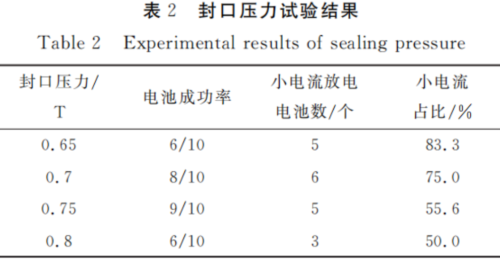 极片厚度为50μm和100μm制成的电池小电流放电比例最低。但是厚度为50μm时极片露箔且称量误差大,所以接下来的试验均采用厚度为100μm的极片。在其他条件相同的情况下,取厚度为100μm的极片制成封口压力分别为0.65T、0.7T、0.75T和0.8T的电池各10只进行试验,试验结果如表2所示。