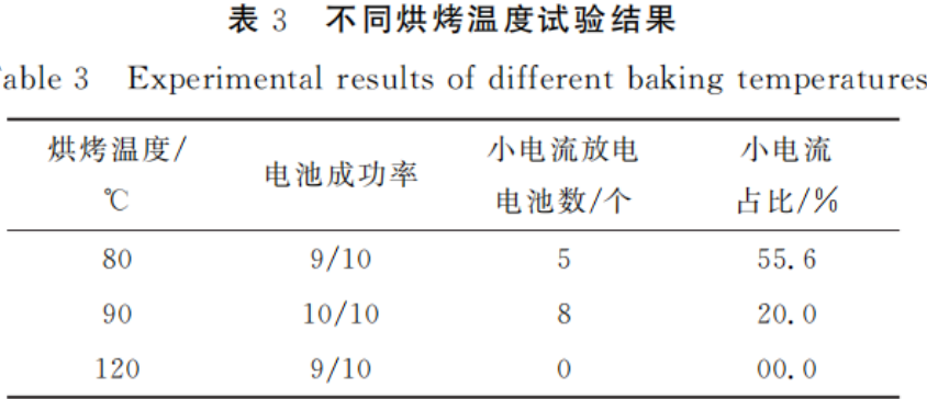 负面影响。而在120℃的条件下,电池内部的水分被更彻底地去除,从而完全避免了小电流放电现象。这一发现证实了高温真空烘烤在去除电池内部水分方面的重要性,因为这些水分如果未被去除,将与电解液发生反应,导致电解液的消耗和电极内阻的增加,最终影响电池的大电流放电能力。