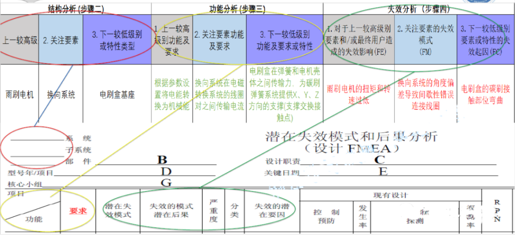 第四步,失效分析,针对前面的每个功能,关注因素的失效就是老版本里所谓失效模式,上一个级别的系统的失效描述就是老版本的失效影响,下一个级别的失效描述,就是失效原因,这部分拯救了被这三失整晕的我;