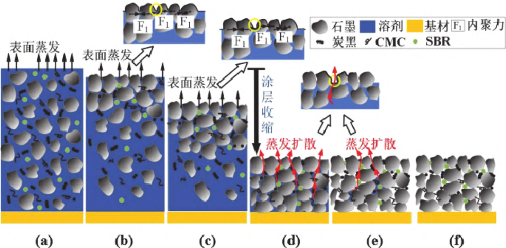 锂电池负极极片涂层的主要溶质颗粒石墨、炭黑弹性模量较大,溶质颗粒堆积过程中,溶质颗粒由于互相接触产生的作用力无法通过形变来抵消,造成内部应力积累,因此锂电池负极极片涂层干燥过程中容易开裂。