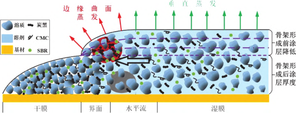 在锂电池负极极片涂层的边缘,厚度的减小使颗粒固结成紧密堆积的结构,该区域的持续蒸发导致一个大的横向流动,将粒子带向填充区域,从而传播紧密填充的前沿。溶剂携带的炭黑、CMC、SBR 颗粒会堆积在界面右侧,溶质颗粒间的孔隙变小,此处形成更大的毛细力。