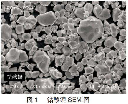 由图1钴酸锂正极材料的扫描电镜图(SEM)可知:材料颗粒大小不一,相对级配型较好,但大颗粒粒径相对更大。
