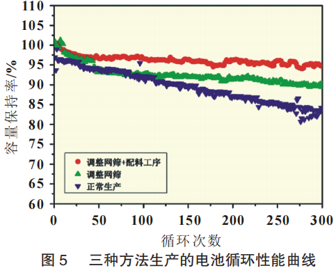 而调整网筛和调整网筛+配料工序生产的电池的循环容量保持率相对较好,均在90%以上,调整网筛+配料工序生产的电池循环性能更佳,容量保持率在94%以上,说明通过调整网筛+配料工序可规避大颗粒对电池极片表面的影响,有效提高电池的循环性能。
