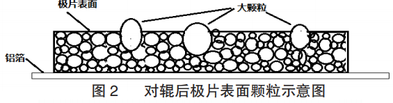 表2中的数据表明:极片辊压后厚度均值为0.124mm,铝箔厚度20um,可计算得单面极片厚度仅为53um,超过44.9um的活性物质大颗粒加上粘结剂、导电剂的颗粒和活性物质小颗粒之间相互叠加,会导致部分大颗粒在极片表面凸显出来,见图 2,在极片表面形成尖点,实际效果如图3所示。因此,经过方法3处理后,大颗粒和回收料排除,颗粒均匀,辊压后极片表面更光滑,预计对后续工序和电池性能有更好的作用。