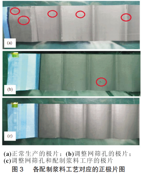 正常配制浆料为:直接用上一次配料的未清理的搅拌机配料,同时加入上一次搅拌过程中的回收料。本文实验在配制浆料的过程中,采用3种配制方法,方法1:按照正常生产进行;方法2:调整网筛筛孔的大小;方法3:调整筛孔大小并调整配料工序(清理搅拌缸内壁、搅拌杆、不加回收料),再进行同一型号不同批次的电性能测试。