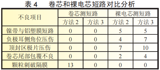 同时,为了对比方法2和方法3,分别对电芯第1次和第2次短路测试的不良裸电芯进行拆解分析原因,具体如表4所示,卷芯短路测试中,方法2的13个不良品均为极片表面颗粒刺破隔膜造成的,而方法3则没有不良品,说明方法3可有效降低颗粒刺破隔膜的短路几率,而裸电芯短路测试分析表明与颗粒表面光滑度无关。