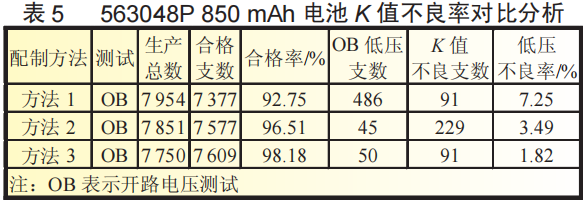 表3为 563048P 850mAh各配制方法制作电池的短路率数据。由表3可知:方法1的电池电芯在装配车间测试裸电芯短路时短路率最大,达3.7%,约是方法2和方法3短路率的10倍。