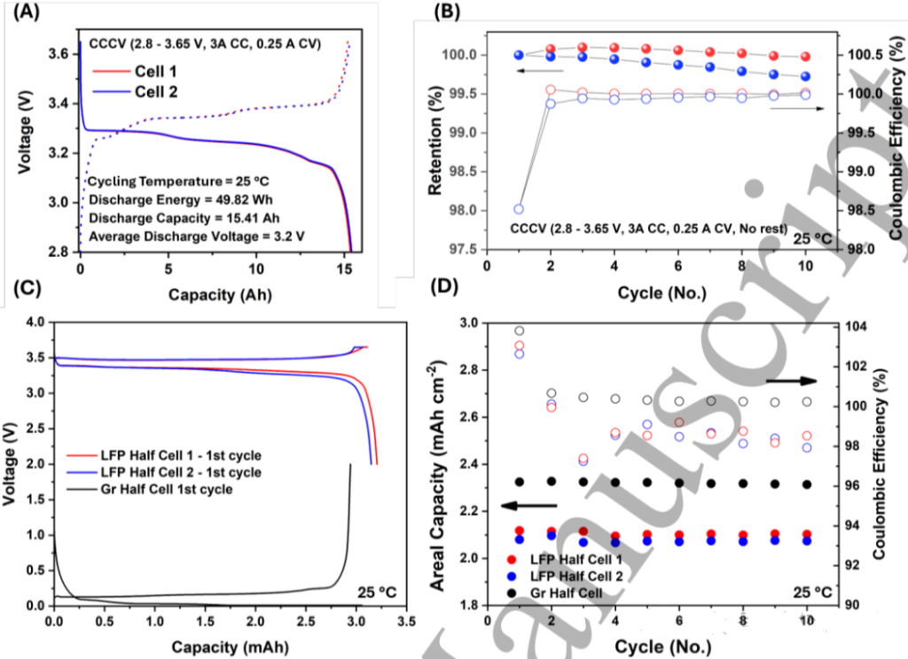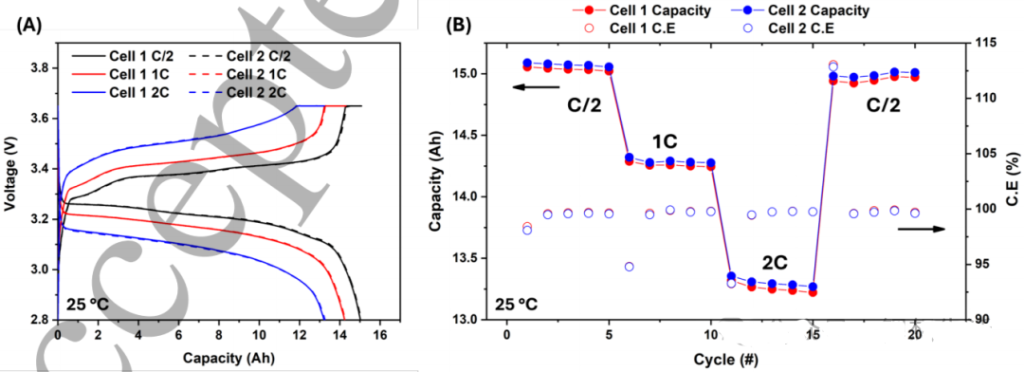 本节所有测试均在两颗独立电芯上重复进行。以C/5(3 A)恒流-恒压(截止C/60)协议在2.8–3.65 V区间循环,测得放电容量15.41 Ah、能量49.82 Wh,平均平台约3.2 V,石墨阶梯与FePO4↔LiFePO4平台清晰,印证LFP/石墨体系(图5A)。据此计算重量与体积能量密度分别为151 Wh kg-1和374.6 Wh L-1,约为特斯拉NMC 4680的60%,主要受限于LFP本征比能低及更长极片带来的集流体、隔膜等冗余质量。连续10圈循环无静置,容量衰减<0.1%,CE逐周升高,显示初期稳定(图5B)。