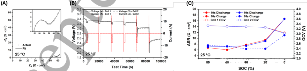 使用新购买的BYD 4680在20% SOC下EIS测得RCT仅5.9 Ω·cm2,Rs 51.5 Ω·cm2。HPPC显示DC内阻随SOC降低而升高,放电方向增幅更显著,中低SOC区尤为明显,体现LFP体系对SOC变化较NMC/NCA更不敏感的低阻抗优势。