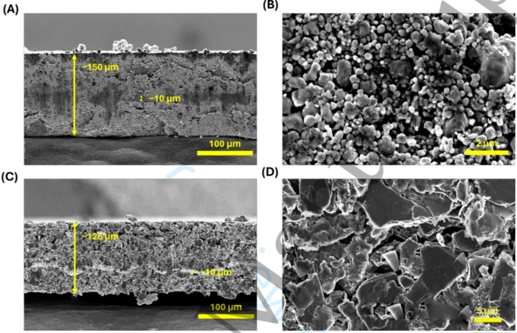 为深入解析LFP与石墨电极,进行SEM表征。图8给出正、负极的俯视与截面照片。