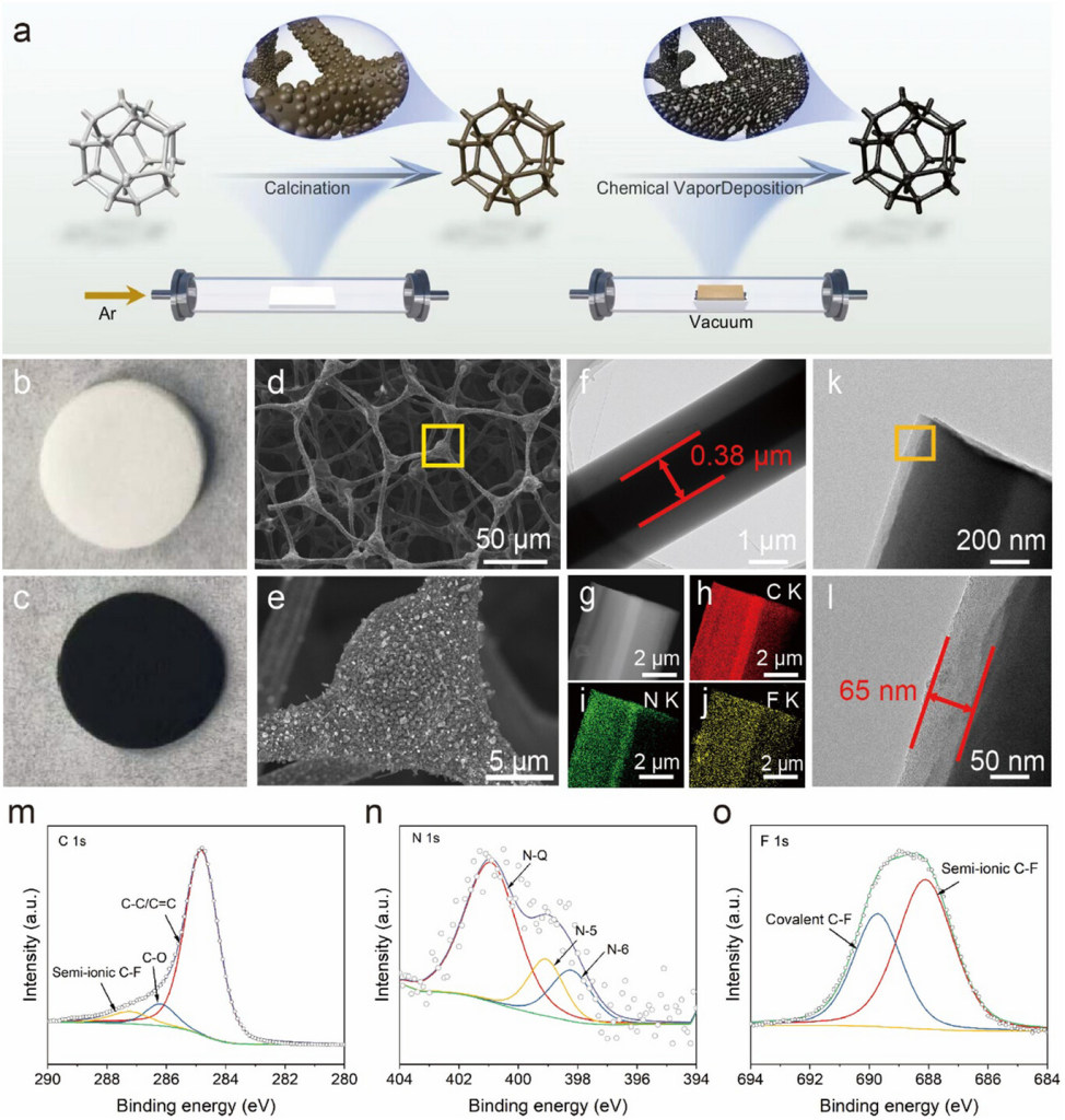 图1. a)FCMF制备过程示意图。b)C3N6H6和c)FCMF的光学图。d)FCMF的低分辨率和e)高分辨率SEM图像。f)FCMF的低分辨率TEM图像。g)FCMF的TEM图像以及h)C、i)N和j)f元素的相应EDS映射。k)FCMF的低分辨率TEM图像和l)相应的放大图。m)C1s、n)N1s和o)F1s的XPS高分辨率光谱(FCMF的)。
