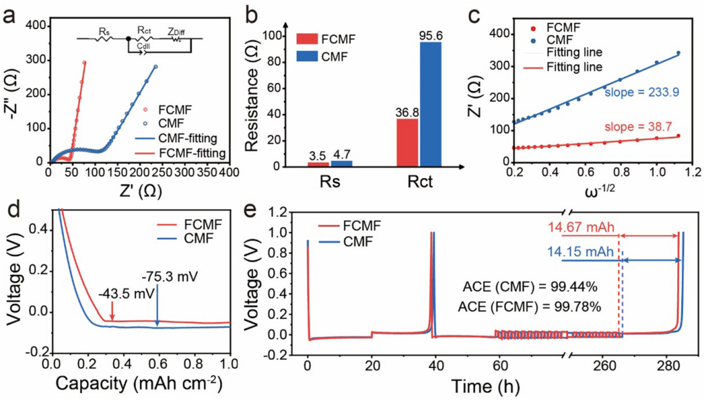 图2. a)循环前CMF|Li和FCMF|Li电池的EIS和b)相应的电阻。c)Warburg阻抗和角频率的倒数平方根之间的线性关系。d)1mAcm−2时FCMF和CMF上的初始锂沉积曲线。e)1mAcm−2、1mAhcm−2下FCMF和CMF的ACE,持续100次循环。