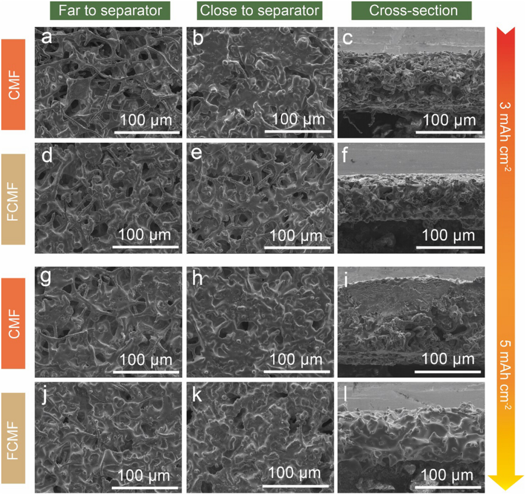图3. 锂电镀容量为3mAhcm−2后,靠近/远离隔膜的表面和横截面的SEM图像:a–c)为CMF;d–f)为FCMF。锂电镀容量为5mAhcm−2后,靠近/远离隔膜的表面和横截面的SEM图像:g–i)为CMF;j–l)为FCMF。