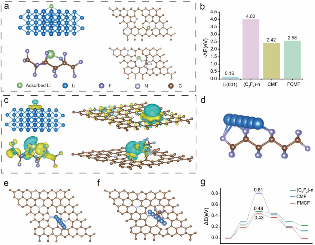 图4. a)Li在Li(001)、(C2F4)-n、CMF和FCMF结构模型上的结合位点。b)Li在Li(001)、(C2F4)-n、CMF和FCMF上的结合能。c)Li在Li(001)、(C2F4)-n、CMF和FCMF上的吸收电荷分布。Li在Li(001)、(C2F4)-n、CMF和FCMF上的结合能。d)(C2F4)-n;e)CMF;f)FCMF结构中Li的扩散路径。g)Li在(C2F4)-n、CMF和FCMF结构中的扩散能垒。
