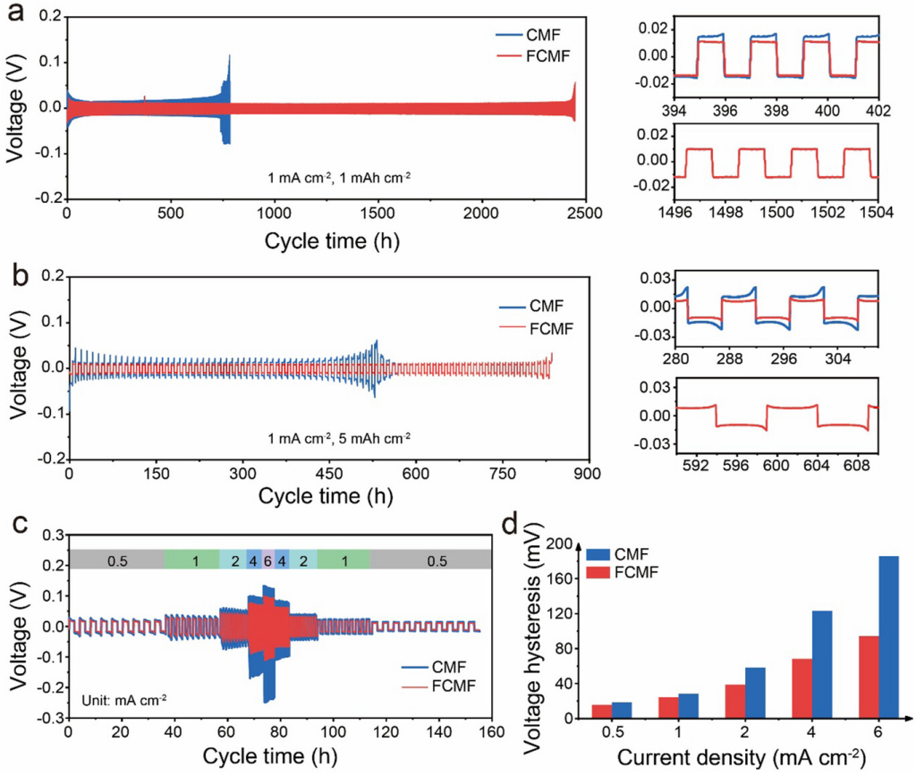 电化学测试:采用Celgard2400作为隔膜的CR2016纽扣电池进行组装,使用1M双(三氟甲烷磺酰基)酰亚胺锂(LiTFSI)溶于体积比为1:1的1,3-二氧戊环(DOL)和二甲氧基乙烷(DME)混合物中,并添加2%硝酸锂(LiNO3)作为电解液,用于对称电池、半电池和锂硫软包电池。对于采用磷酸铁锂(LFP)正极和高能NCM811正极组装的全电池,电解液为体积比为3:7:1的碳酸亚乙酯(EC)、碳酸乙甲酯(EMC)和碳酸氟亚乙酯(FEC)混合物中的1M六氟磷酸锂(LiPF6)。所有电化学测试均在30°C的恒温下进行。库仑效率(CE)测试以纯锂为对电极,首先在0.768mA的电流下将固定量的锂(7.68mAhcm⁻²)预沉积到CMF/FCMF上。随后,这些电池经过特定的恒电流充放电循环,并以0.768mA的电流充电至1V,从而可以根据最终充电容量计算平均库仑效率。纽扣电池的恒电流测试在NewareBTS82多通道电池测试系统(深圳市新威尔电子有限公司)上进行。电化学阻抗谱(EIS)测量在PrincetonPARSTAT4000(AMETEKInc.)上进行,频率范围为1×10⁵Hz至0.1Hz,幅度为5mV。磷酸铁锂(LFP)和硫/碳(S/C)正极的质量负载分别约为11.9mgcm⁻²和3.5mgcm⁻²。