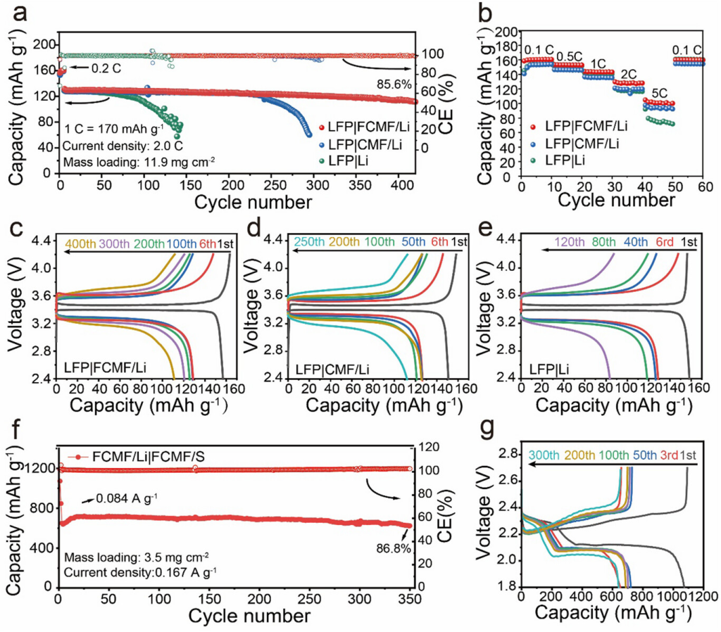 图6. a)LFP|Li、LFP|CMF/Li和LFP|FCMF/Li全电池的循环性能和b)倍率性能。c)LFP|FCMF/Li、d)LFP|CMF/Li和e)LFP|Li电池在不同循环下的电压-容量曲线。f)同时使用FCMF作为负极集流体和正极/隔膜之间夹层的Li-S电池的循环性能和g)相应的电压-容量曲线。