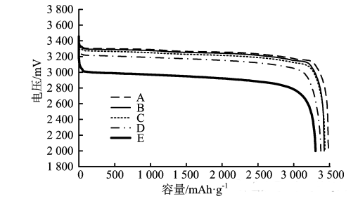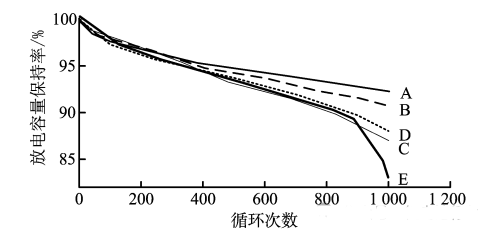 通过控制电解液在干燥房的暴露时间来获得不同水分含量的电解液,同时组装磷酸铁锂软包电池进行测试。标记电解液水分含量分别为20 ppm( A) 、60ppm( B) 、120 ppm( C) 、250 ppm ( D) 、500 ppm( E)。