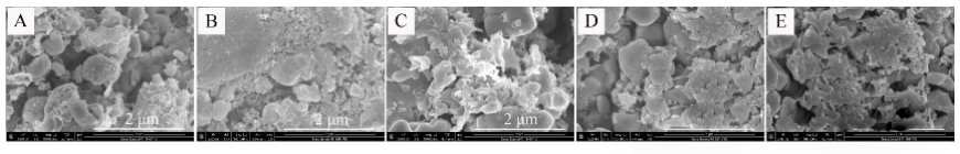 A为循环前SEM图,BCDE分别对应不同水分含量的极片,after 200 cycle later