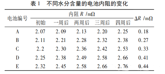 由上表看出,随着水分含量的增加,电池的内阻呈逐渐上升的趋势,并且存储四周后内阻的增加值也逐渐上升。这主要是由于水分含量低时,能形成均匀致密的SEI膜,此时电池内阻较小。而当水分含量高时,副反应较多,副反应产物POF3和LiF增多,导致电池内阻增大。