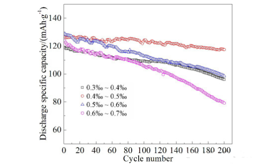 随着循环的进行,正极片水分含量超过0.6‰的电池容量急速衰减,性能恶化,循环200周后容量衰减至79.2mAh·g-1, 仅为初始容量的63.81%。