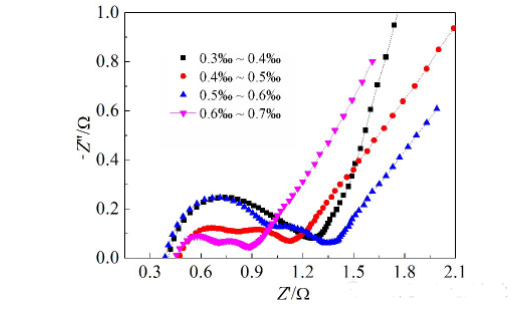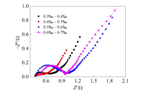 由化成后EIS曲线可以看出,当水分大于0.6‰后,阻抗谱半圆与横坐标的交点向右偏移,表现为内阻的增大,离子电导率的降低。而循环200圈之后的图谱,水分含量越大,曲线有多个圆弧,表示多界面的形成,可能与副反应生成新的物质有关。