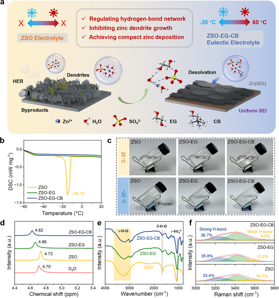 枝晶生长和界面副反应通常会降低锌离子电池的性能,阻碍其在可再生能源存储中的实际应用,特别是在恶劣条件下。本文提出了一种通过共溶剂和添加剂工程设计水合共晶电解质的方法,以乙二醇 (EG) 和微量溴化胆碱 (CB) 为典型的ZnSO4电解质。分子动力学模拟和光谱分析表明,限制在Zn2+溶剂化壳中的H2O分子通过氢键配位进行调控。更重要的是,EG共溶剂有效抑制了游离 H2O的活性并扩展了电解质的工作温度范围。此外,CB 添加剂在锌负极表面的优先吸附不仅可以引导锌沿 (002) 平面沉积并提高均匀性,而且还参与构建异质有机-无机固体电解质界面层。所设计的ZSO-EG-CB电解质赋予Zn||Zn对称电池在5mA cm−2电流密度下超过8500小时的超长寿命,同时使Zn||NVO全电池在宽温度范围(−20至60 °C)内具有优异的倍率性能和高循环稳定性。该工作通过协同溶剂化环境调控和界面工程建立了双调控范式,为宽温锌金属电池中的高性能电解质提供了一种有前景的策略。