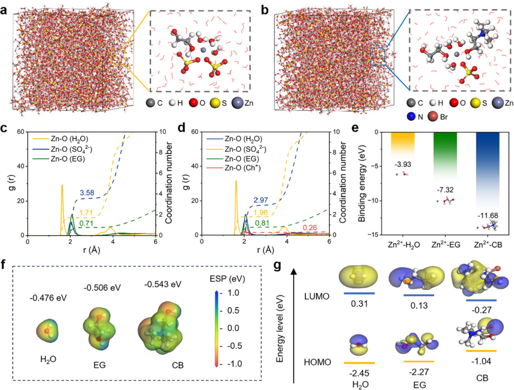 图2. Zn2+溶剂化结构的理论计算。a) ZSO-EG和b) ZSO-EG-CB 电解质的MD模拟获得的典型 Zn2+溶剂化结构的3D快照。c) ZSO-EG 和 d) ZSO-EG-CB电解质的MD模拟收集的Zn2+的RDF和配位数分析。e) 几种二聚体的结合能的DFT计算结果。f) 静电势 (ESP) 映射和 g) H2O、EG和CB分子的最低未占据分子轨道 (LUMO) 和最高占据分子轨道 (HOMO) 能量值。相应的分子结构和几何结构如插图所示。