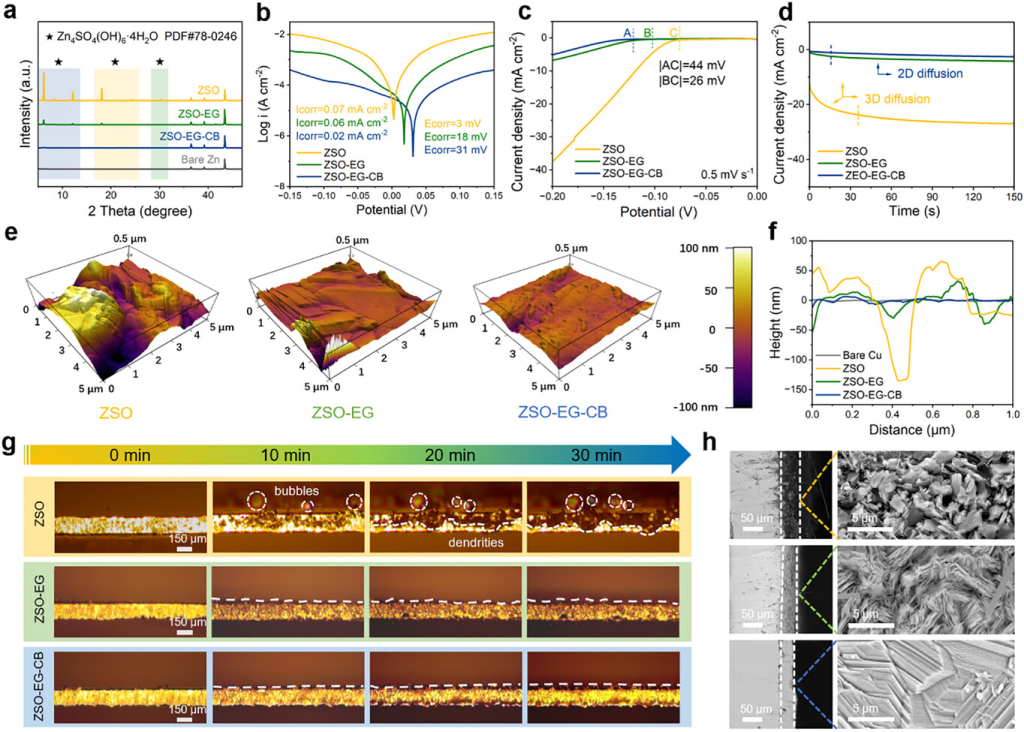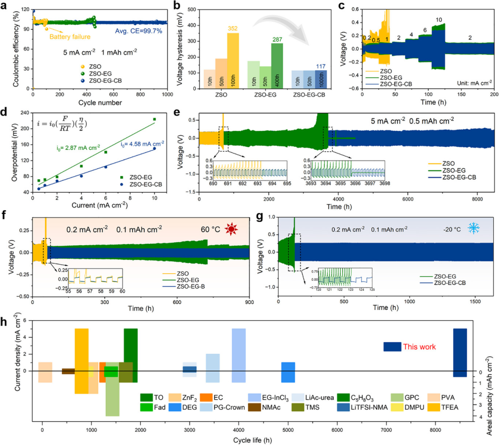 图4. 三种电解质中锌负极的可逆性和稳定性。a) Zn||Cu电池在5.0mA cm−2和1.0mAh cm−2下的库仑效率(CE)b) Zn||Cu非对称电池在不同循环下的电压滞后值。c) 固定面积容量为1.0mAh cm−2的Zn||Zn对称电池的倍率性能。d) 交换电流密度。e) 室温下Zn||Zn对称电池的循环性能(插图:高分辨率电压曲线)。f) 60 °C和g) −20 °C下Zn||Zn对称电池的循环性能。h) ZSO-EG-CB体系与以往文献中报道的其他体系的比较。