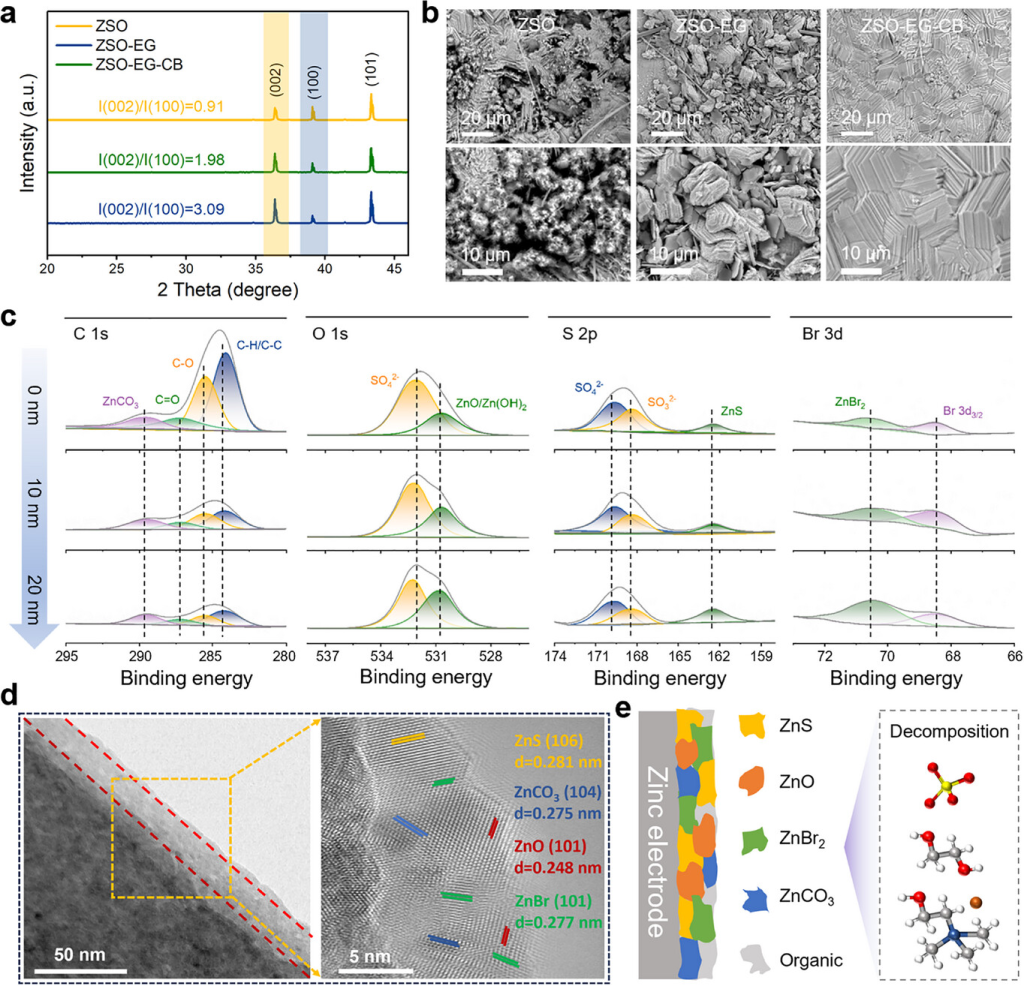 图5. 锌负极表面形成的SEI层的组成和结构。a) XRD图谱和b) SEM图像,为Zn||Zn电池在三种电解质中循环50次后锌负极表面的图谱。c) ZSO-EG-CB电解质中循环锌负极表面的深度剖析XPS分析和d) TEM图像。e) ZSO-EG-CB电解质中形成的SEI组分示意图