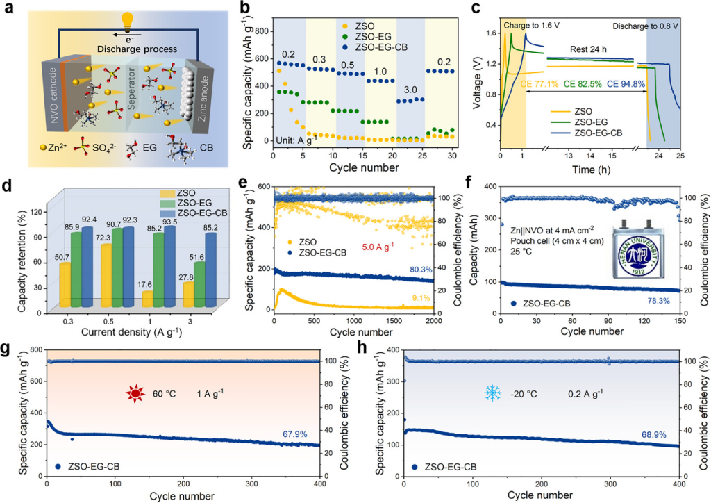 图6. 三种电解液的电化学性能。a) 采用 ZSO-EG-CB电解液的Zn||NVO全电池放电过程示意图。b) 采用三种电解液的 Zn||NVO 全电池的倍率性能。c) Zn||NVO 全电池充电至1.6 V、静置24小时并放电至0.6 V后的容量保持能力。d) 在不同电流密度(0.3、0.5、1.0 和 3.0 A g−1后400次循环)下的容量保持能力。e) 5.0 A g−1下的长期循环性能。f) 采用ZSO-EG-CB电解液的Zn||NVO软包电池的电化学性能。采用ZSO-EG-CB电解液的Zn||NVO电池在 g) 60 °C 和 h) −20 °C 下的宽温性能。