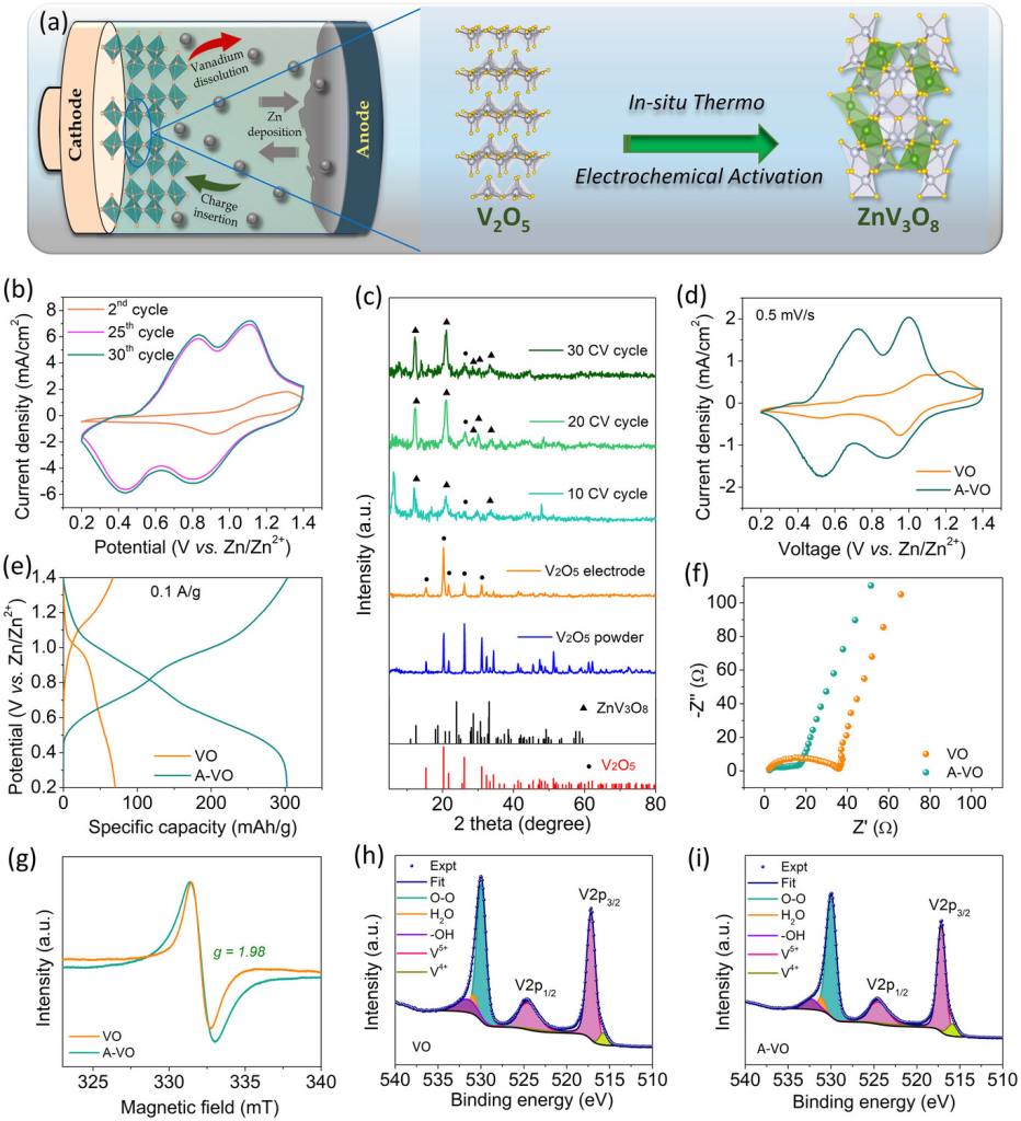 图1. a)热电化学活化示意图。b)扫描速率为5mVs−1的循环伏安法活化。c)原始V2O5的XRD图和非原位XRD图。d)扫描速率为0.5mVs−1时活化前后的循环伏安法比较。e)电流速率为0.1Ag−1时的恒电流充放电比较。f)活化前后电极的电化学阻抗谱比较。g)EPR光谱比较。h)VO和i)A-VO样品的V2p和O1s高分辨率XPS。