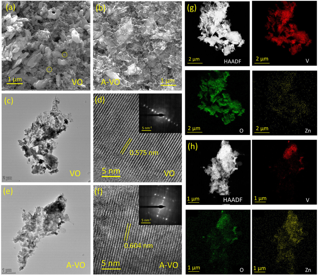 图2. a)VO和b)A-VO的FESEM图。c)TEM和d)带有SAED插图的VO的HRTEM图。e)TEM和f)带有SAED插图的A-VO的HRTEM图。g)和h)分别为VO和A-VO的TEM能量色散X射线光谱(EDS)映射图。