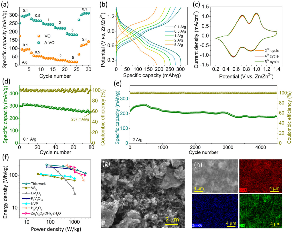 图3. VO和A-VO电极的电化学性能。a)VO和A-VO的倍率性能比较。b)A-VO在不同电流速率下的恒电流充放电曲线。c)A-VO电极的循环伏安稳定性。d)0.1Ag-1和e)2Ag-1下的循环稳定性性能以及相应的库仑效率。f)A-VO样品的Ragone图。g)FESEM图,以及h)循环稳定后电极的FESEM-EDS图。