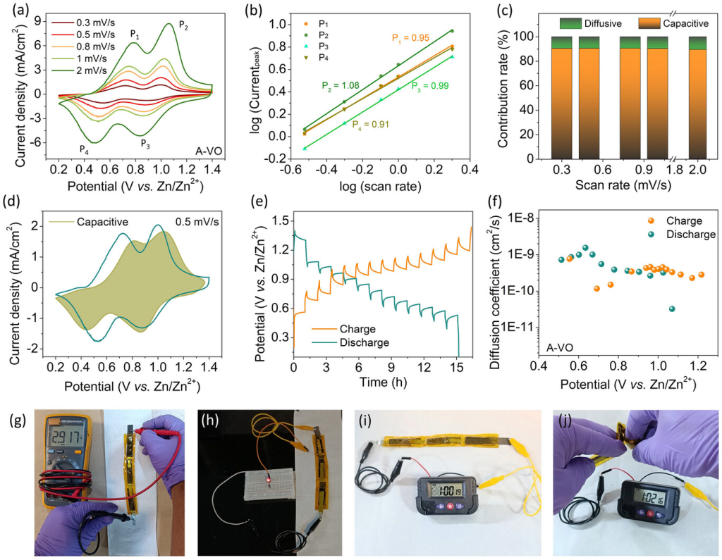 图4. a)不同扫描速率下A-VO样品的CV曲线。b)来自CV曲线的log(i)和log(v)的线性相关的b值曲线。c)不同扫描速率下电容和扩散过程的贡献比较。d)扫描速率为0.5mVs−1时CV中的电容贡献。e)电流密度为50mAg−1时A-VO电极的GITT曲线。f)充电和放电过程中Zn2+离子的扩散系数。g)串联电池的电压输出电压图片。h)LED发光,i)由电池供电的LCD运行。j)不影响LCD电源的柔性电池图片。