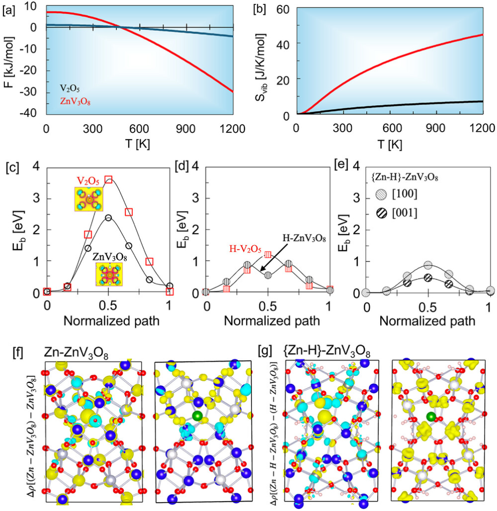 图5. DFT计算了V2O5(橙色)和ZnV3O8(蓝色)的a)声子自由能(F)和b)振动熵(Svib)随温度(T)的变化,突显了在较高T下晶格贡献的增加,表明ZnV3O8的稳定性提高。自旋极化DFT计算了c)无氢和d)部分氢化的V2O5(非磁性)和ZnV3O8(亚铁磁性;FiM)中Zn离子扩散的CI-NEB最小能量路径。e)在完全氢化的ZnV3O8中,Zn离子沿[100]和[001]两种不同路径扩散。f)Zn-ZnV3O8和g){Zn-H}-ZnV3O8的电荷密度差(左)和磁化密度(右)。质子化或氢化会导致电荷和自旋分布不均匀,从而减少Zn-O相互作用,这意味着迁移阻力更小,从而提高Zn离子的迁移率。