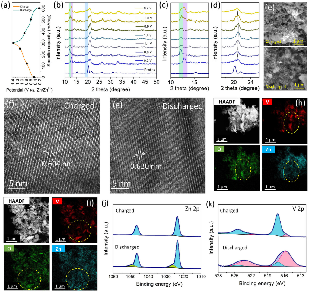 图6. a)电流密度为0.1Ag−1时选定状态下的充放电曲线。b)在选定的充放电电位状态下A-VO电极的非原位XRD图。c,d)放大的非原位XRD图。e)充电和放电条件下A-VO电极的FESEM图。f,g)HRTEM图,h,i)EDS映射j,k)A-VO电极循环前后的XPS。