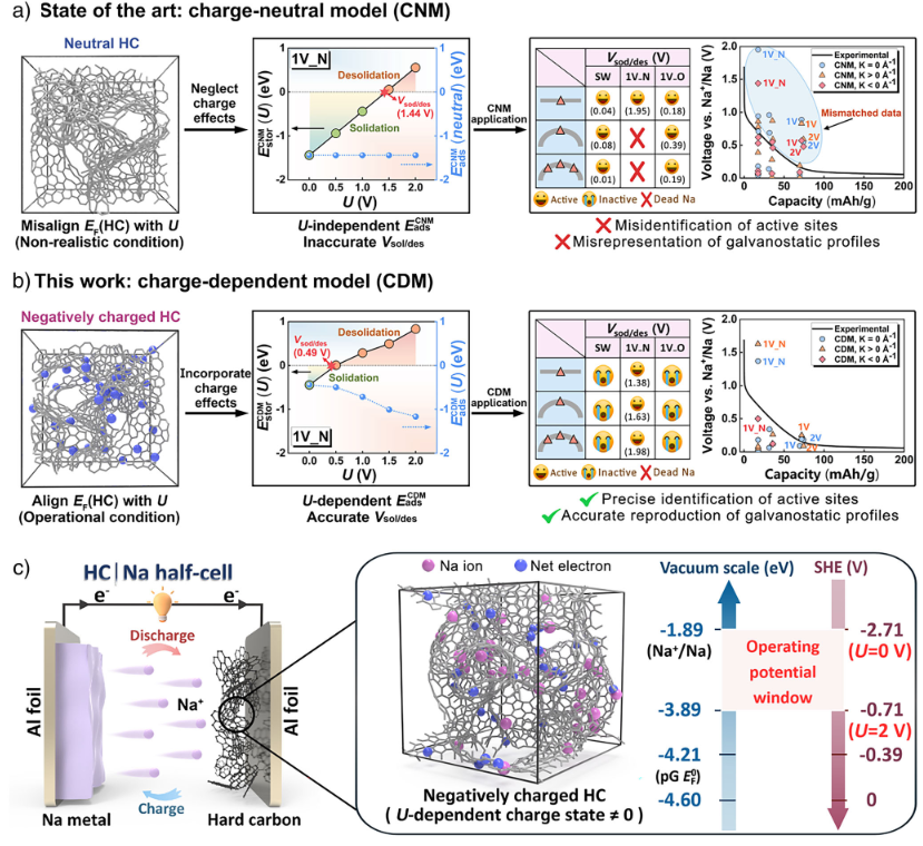 图1.传统CNM与CDM在HC中储钠的比较分析。a)传统CNM的局限性:由于忽略了电势驱动的电荷效应,导致活性储钠位点识别错误,实验恒电流钠化电压曲线描述错误。b)CDM的进步(本研究):明确积分电势驱动的电荷效应,可以精确识别活性储钠位点,并准确再现实验恒电流钠化电压曲线。CDM解决了理论与实验之间的差异,建立了一个稳健的计算框架来阐明HC中的储钠机制。c)HC|Na半电池结构示意图(左)以及电池运行过程中HC负极的工作电势窗口,突出显示了由U驱动的HC的动态电荷状态演变(右)。