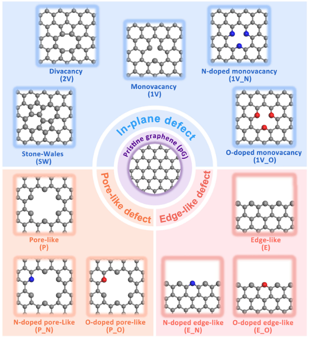 图2.缺陷扁平碳层的结构模型。代表性结构包括面内缺陷(蓝色区域)、孔状缺陷(橙色区域)、边缘状缺陷(粉色区域)和杂原子掺杂(N和O)。原始石墨烯(紫色区域)作为参考。灰色、蓝色和红色球分别代表C、N和O原子。